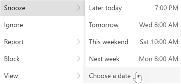 Sometimes email is very important, but not yet. With the Snooze feature, you can schedule a time for the email to be re-delivered to your inbox, appearing at the time you want it to, so you can handle it when it’s the right time for you. Just right-click any message and choose Snooze, or select Snooze from the ribbon. Then choose the time you want it to be delivered.